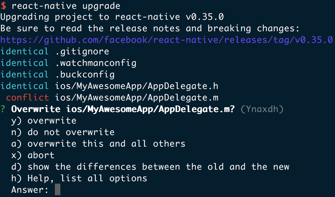 Today I am proud to introduce a new tool that helps solve this problem. The tool is called react-native-git-upgrade and uses Git behind the scenes to resolve conflicts automatically whenever possible.